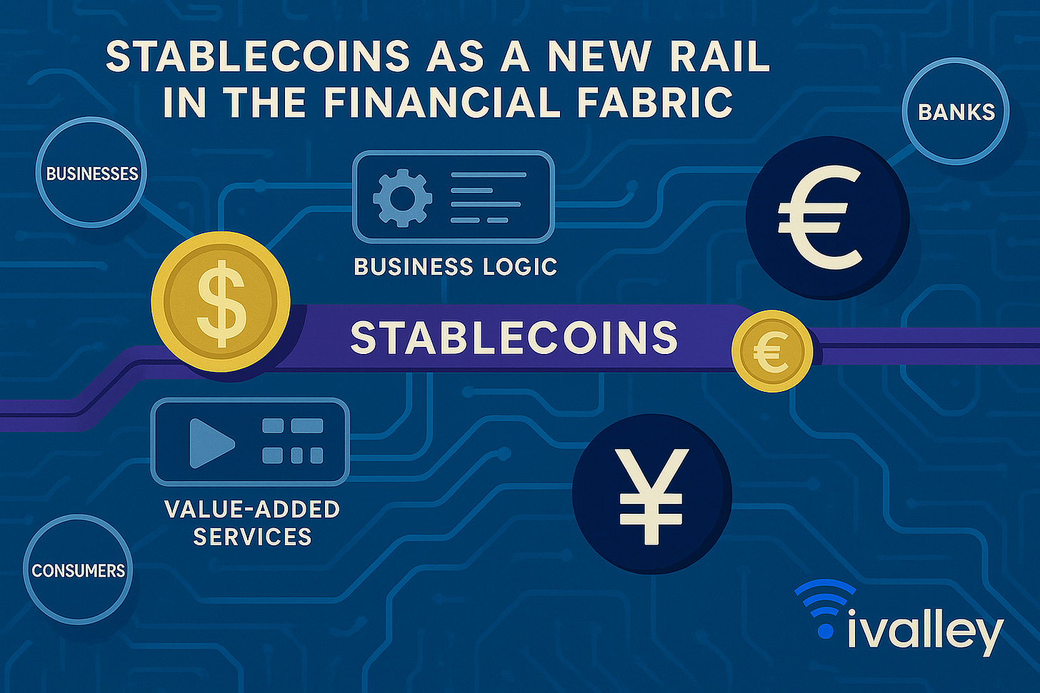 Stablecoin is the digital currency that rides a blockchain rail—so payments settle fast and the rules (business logic) can be coded, with add-ons like invoicing, KYC/AML checks, or automated payouts and more.
