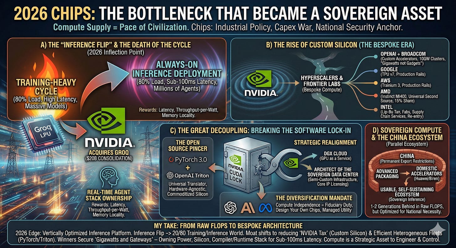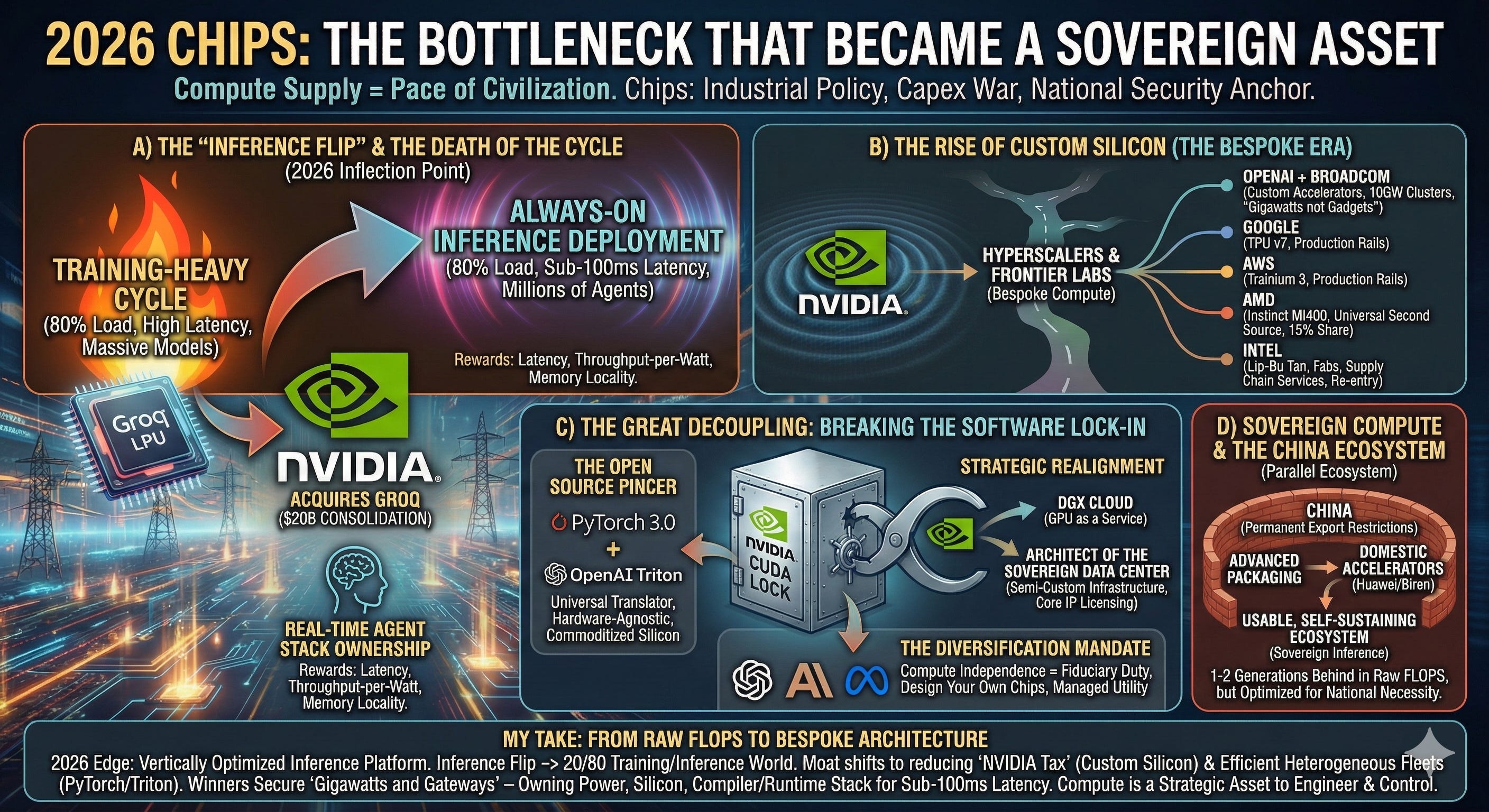 The chip war has moved from “raw FLOPS” to bespoke compute architecture—and in 2026 the edge isn’t simply the fastest GPU, but the most vertically optimized inference platform. As the “inference flip” pushes workloads toward a 20/80 training-to-inference world, the moat shifts to players who can reduce the “NVIDIA tax” with custom silicon (e.g., OpenAI/Broadcom) and those who can run heterogeneous fleets efficiently via hardware-agnostic software layers (PyTorch/Triton). The winners will secure gigawatts and gateways—owning not just silicon, but the power and compiler/runtime stack that lets agents think, negotiate, and transact at sub-100ms latency—because compute is no longer a commodity to buy, it’s a strategic asset to engineer and control.