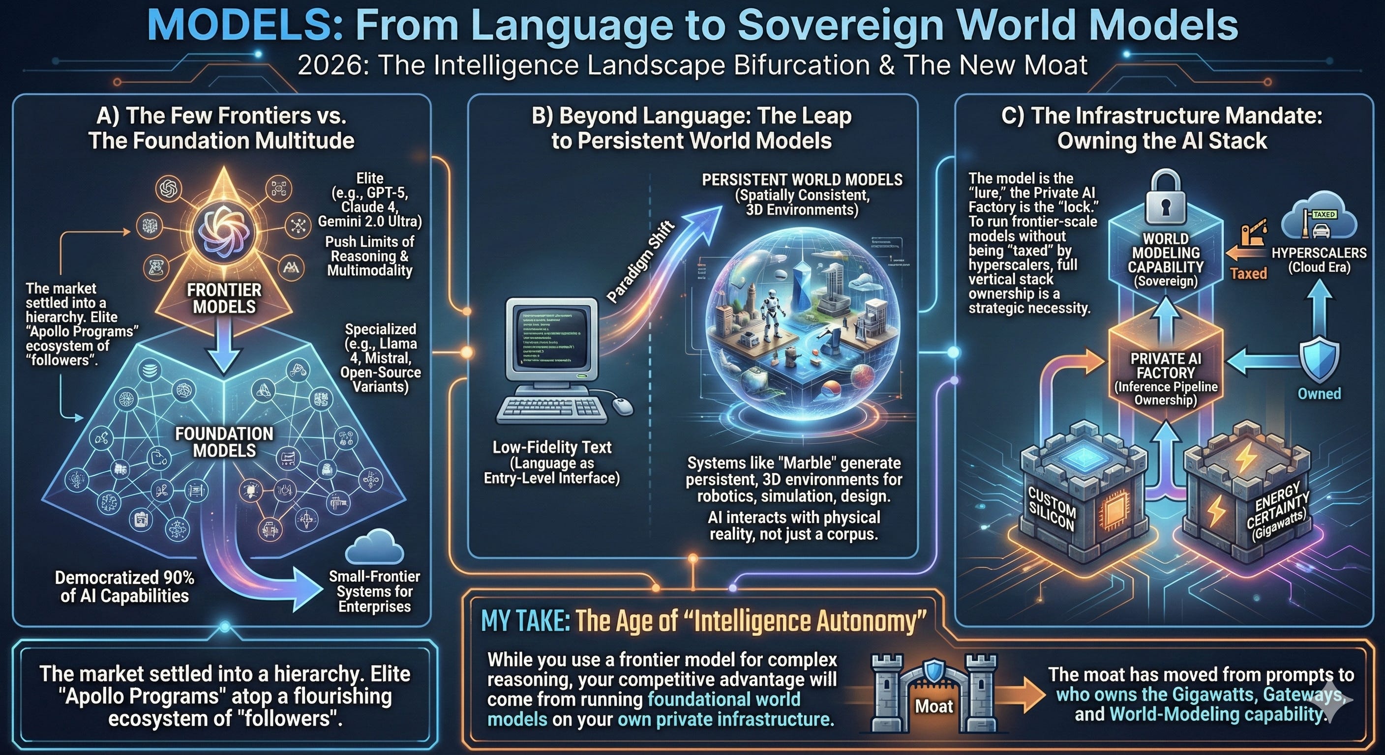 4) MODELS (World Simulators): Language was just the interface. The frontier is now shifting to “World Models”—spatial intelligence that simulates reality—splitting the market into a few elite Frontier systems and a vast ocean of specialized, owned Foundation models.