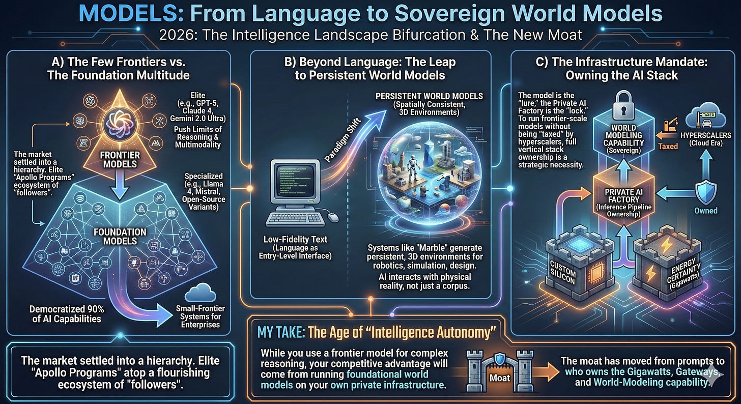 My Take: We are entering the age of "Intelligence Autonomy." While you might use a frontier model for your most complex reasoning, your competitive advantage will come from running foundational world models on your own private infrastructure. The moat has moved from who has the best prompt to who owns the Gigawatts, Gateways, and World-Modeling capability.
