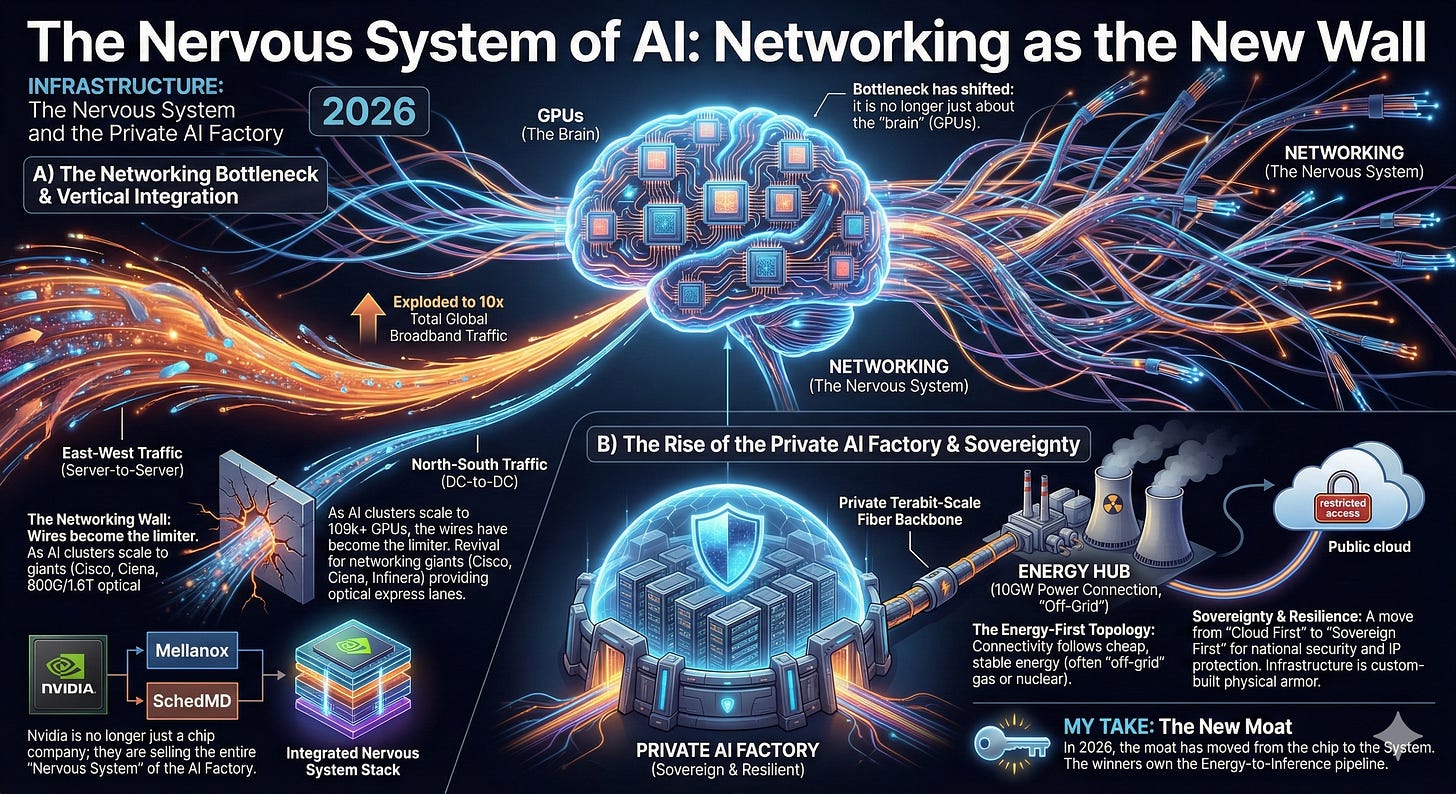3) INFRASTRUCTURE (The Nervous System): The bottleneck has shifted from the brain (GPU) to the nervous system (Networking). The new battleground is the “Private AI Factory”—terabit-scale, physically secure, and designed to keep data sovereign rather than renting it to hyperscalers.