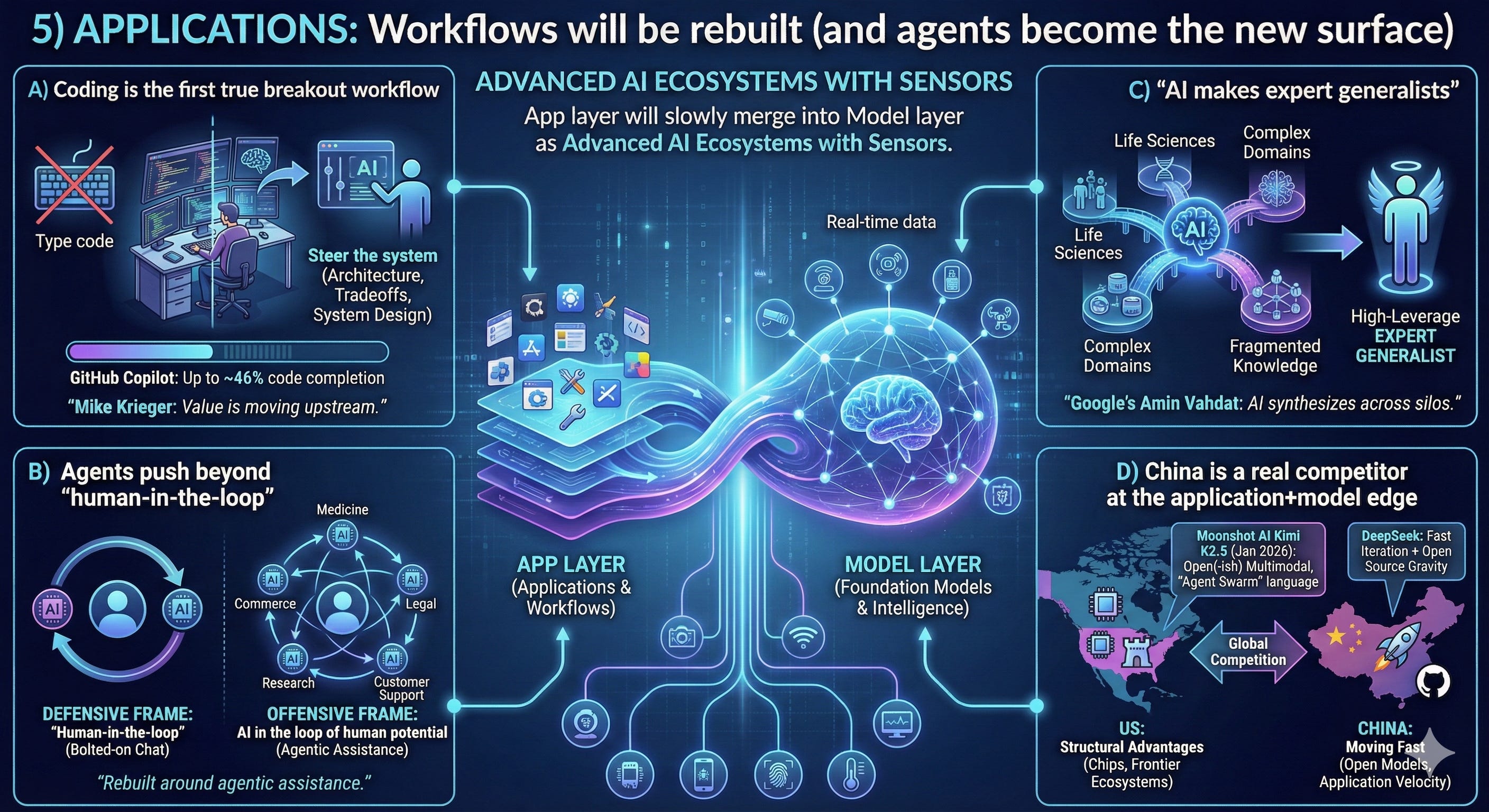 5) APPLICATIONS (The Agentic Workforce): The “App” and “Model” layers are collapsing into one. We are moving from “humans-in-the-loop” to “AI-in-the-loop,” where software doesn’t just assist workflows but fundamentally rebuilds them through autonomous agents.Macro frame:
