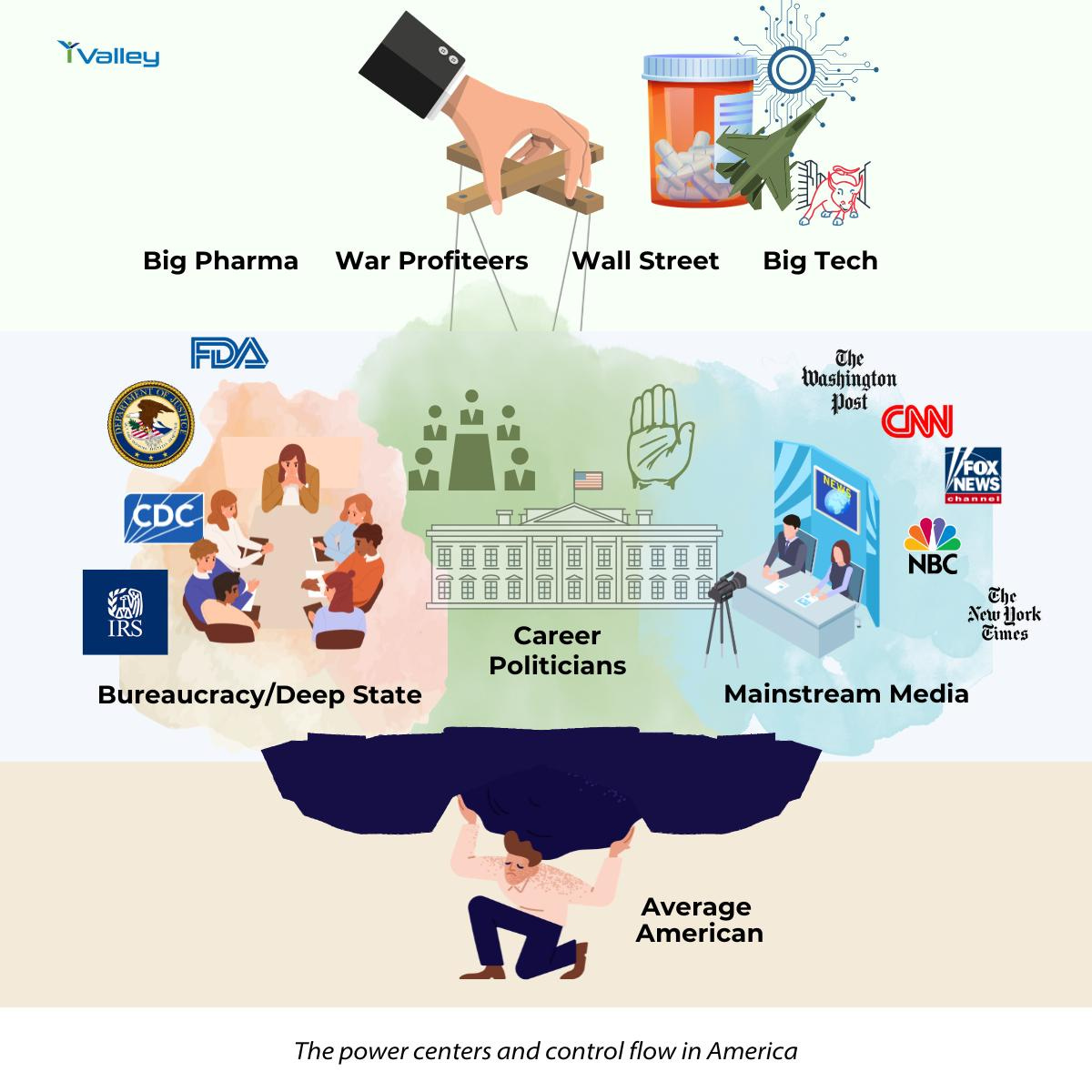 The political opposition to Donald Trump has often been characterized as a clash between a disruptor and the entrenched establishment. According to Tucker Carlson, this isn’t the first time a president has challenged the Washington D.C. orthodoxy—an intricate state apparatus composed of bureaucrats, government agencies, lobbyists, and industry power brokers. These forces, often referred to as the "deep state," are viewed as the ultimate centers of power in America sort of a permanent state. See figure 1 for depiction of this value chain and how monied industrial complexes wield their control.